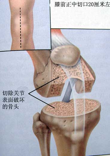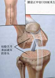 手术过程 手术人员准备好后,您会被送进手术室。首先进行麻醉,这能够使您在睡眠中度过手术过程,或使腰部以下麻木。然后,在膝关节前方做切口,有病损的骨将被清除,代之以新的关节。然后缝合切口。