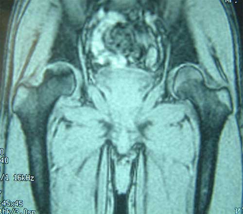 股骨头缺血性坏死MRI显示坏死区 微创手术方法,采用隧道减压刮除死