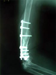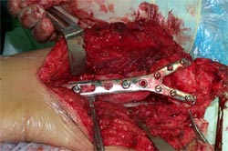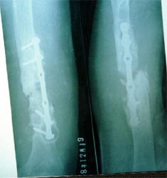 图1-1我们用钢板固定骨折端提供支撑力,患者自体骨髓细胞经与异体骨和骨生长因子复合, 使没有细胞的植骨材料变成了有细胞的活骨。