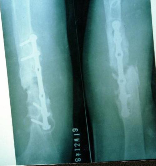 带锁髓内钉固定骨折端提供支撑力,患者自体骨髓细胞经与松质骨和骨生长因子复合, 使没有细胞的植骨材料变成了有细胞的活骨。骨折在8个月后愈合。
