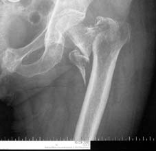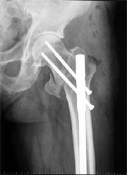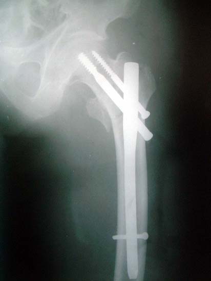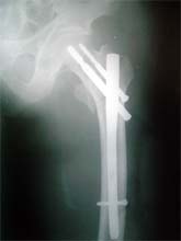 股骨粗隆间骨折,采用闭合股骨重建钉内固定。