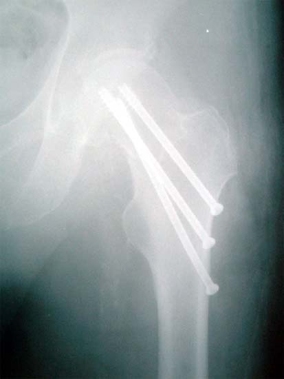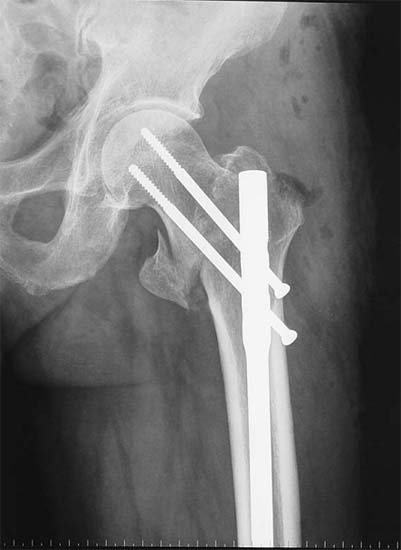 钉-板系统,目前临床上最常用的钉-板是动力髋螺钉(DHS)。动力髋螺钉通过较粗的拉力螺钉及带套筒的侧方钢板,将股骨头颈与股骨干固定为一体,具有加压和活动双重作用,结构坚固,可有效防止款内翻。钉可以延套筒滑动,骨折间隙减少,有利于骨折愈合。