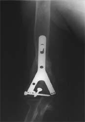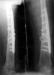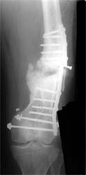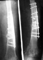 股骨远端骨折术后10年,4次手术均失败。经带锁髓内钉内 固定、植骨,骨生长因子和骨髓细胞注射,成功治愈
