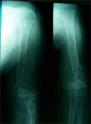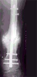 骨不连又称骨折不愈合,表现为骨痂生长缓慢或不生长。我们采用新型的生物材料结合手术的方法治疗骨不连,获得良好效果。 将高效骨生长因子和患者骨髓细胞混合,注射到骨折区域,骨生长因子刺激骨痂形成并且促进骨髓细胞转变为成骨细胞,有效促进骨修复。