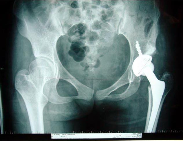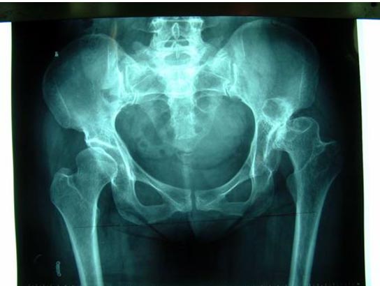 患者男性,52岁,左股骨颈骨折,曾经用空心钉和DHS固定, 两次手术均失败,股骨颈吸收,下肢短缩,疼痛,活动受限。