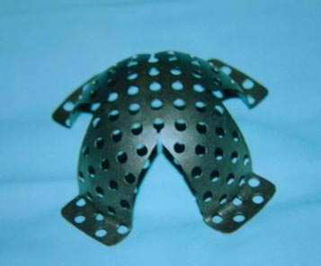 行翻修手术。术中发现臼底已经穿透入盆腔,用钛网和植骨方法修复髋臼,股骨侧用非骨水泥假体固定。