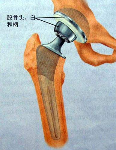 手术示意图:切除股骨头,磨平髋臼,新髋臼植入臼窝, 新假体的柄插入股骨,柄上安装新股骨头。假体柄可嵌入或骨水泥固定