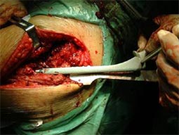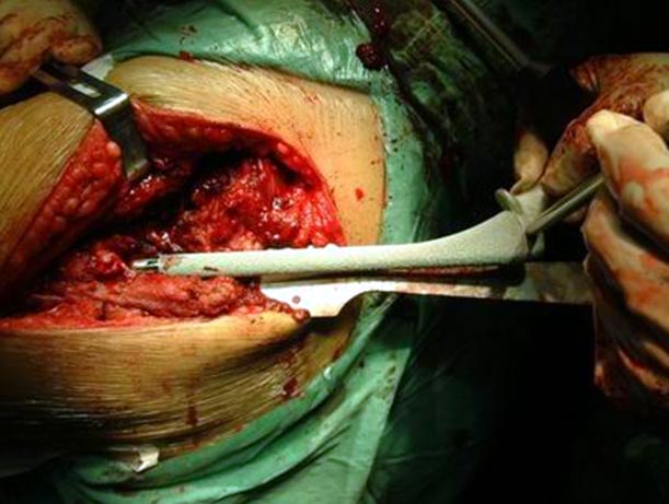 由于股骨近段两次手术均失败,导致股骨近段有骨质疏松骨缺损, 采用长柄的生物固定型股骨柄假体插入。