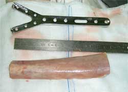 肱骨远段骨折,骨缺损。多次手术失败 准备植入的大块异体骨13厘米长,采用Y型钢板固定