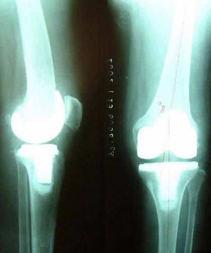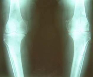 图 膝关节内翻的X线片,膝关节软骨碎裂、磨损,双膝内翻,关节间隙消失。 患者经过长期的保守治疗,如吃中药、西药、贴膏药、理疗、关节内打针,开始有些效果,但这些治疗是不能去根儿的,最终病变越来越重,所有的保守方法都无效了。