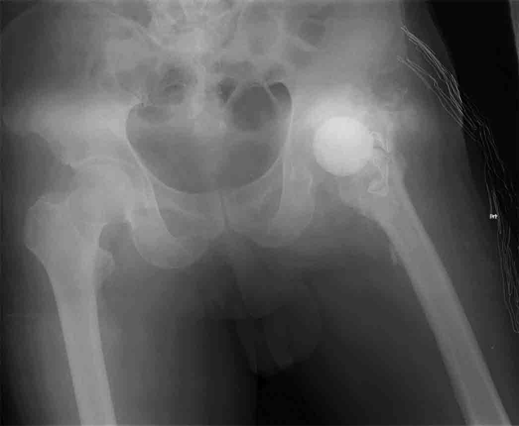 患者55岁,男,股骨颈骨折内固定手术后感染3年,伤口窦道形成,股骨头已经大部吸收,有死骨.曾诊断为骨髓炎.我们首先一期进行髋关节感染后病灶清除,清除死骨肉芽和股骨头.用自制的抗菌素万古霉素骨水泥球作为填充器,放置在头臼位置,一期关闭伤口.伤口愈合.6个月后,检查血沉CRP血象正常激发实验阴性,进行初次全髋关节置换术.手术成功.感染无复发,功能良好.