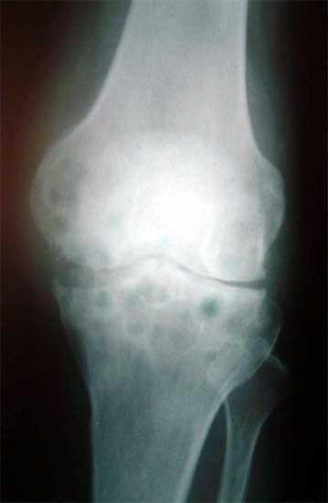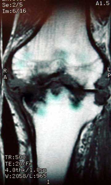 膝关节类风湿关节炎,胫骨近端骨缺损,成蜂窝状 MRI显示骨破坏程度