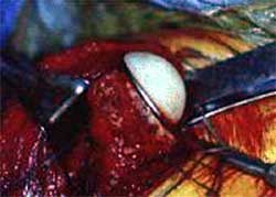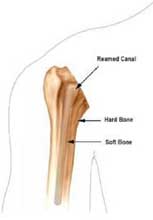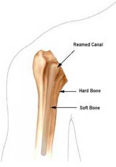 4、肱骨髓腔的扩髓。从小号的钻头开始,逐渐增大直到与假体直径合适为止,同时轻度外翻。如果必要,在肱骨结节上开槽以容纳假体柄上的侧翼。槽的位置应该在二头肌沟的后方。 5、将假体试模插入髓腔 确保假体颈能够在肱骨的中央。以假体颈为标志,去除所有肱骨颈周围的骨赘。将假体试模插入肱骨近端髓腔,仔细检查假体的高度、方向和固定情况。