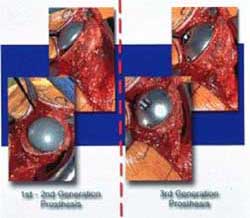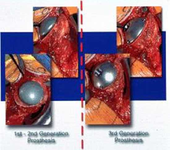 二十世纪八十年代,出现了许多组合化的肱骨假体类型,其目的是尽量适应在肱骨形状、髓腔直径和可使用的关节空间等方面的多样性。在关节盂方面则出现许多非骨水泥固定假体,其固定方式为螺钉和金属表面的多孔涂层。 九十年代,人们开始注意恢复关节正常的解剖位置、运动和盂肱关节的方向,还有先进的软组织平衡技术与关节的生理性稳定。