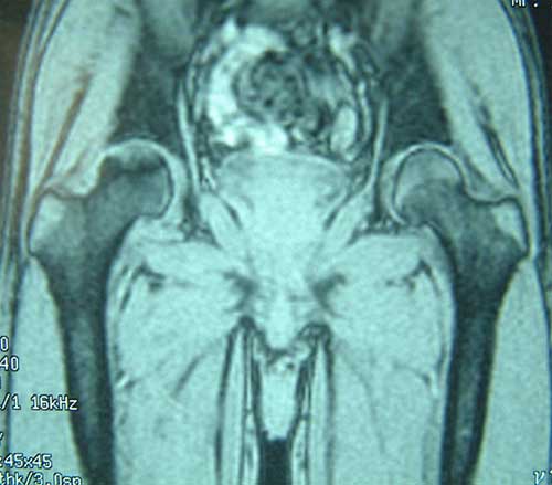 股骨头缺血性坏死MRI显示坏死区 微创手术方法,采用隧道减压刮除死骨